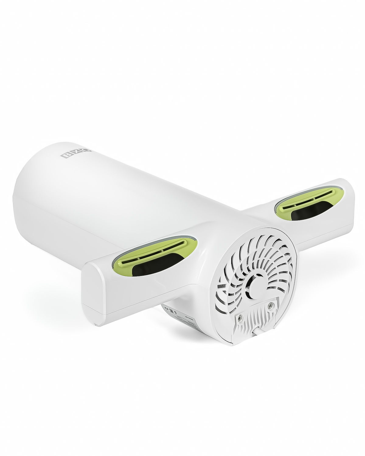 Дизайн сушилки выполнен в элегантном стиле. Воздуховодные отверстия размещены по корпусу с левой и с правой стороны для каждой руки раздельно! В состав воздуховодных отверстий дополнительно включены антибактериальные и антигрибковые компоненты, предотвращающие возникновение и размножение бактерий, грибков и плесени в воздуховодном тракте. Данная зона выделена специальным желтым цветом.